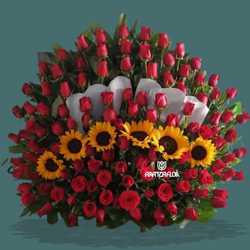 Excelente combinación de rosas rojas y girasoles, Arreglos listo para ver y disfrutar, un excelente regalo que mama disfrutara, servicio a domiclio Morelia, Flores a domicilio en Morelia