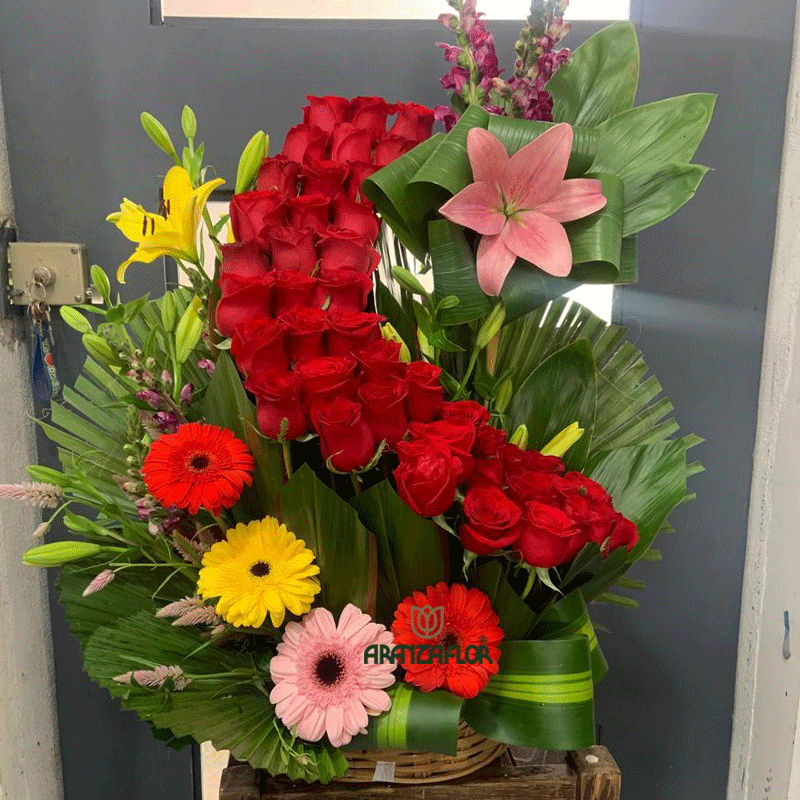 Hermosa canasta de carrizo con 50 rosas rojas follajes y flores exóticas, de 70 cm de alto por 50 de ancho