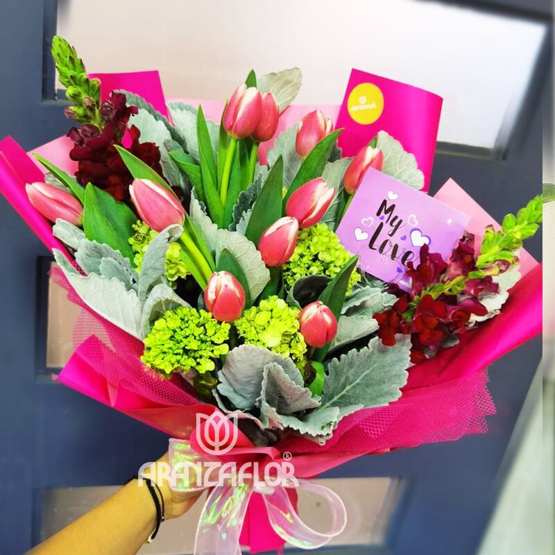 HERMOSA COMBINACION DE TULIPANES Y FOLLAJES EXOTICOS, CONTIENE 10 TULIPANES Y HORTENSIAS, LOS COORES PUEDEN VARIAR, EN INTENSIDAD DE TONO