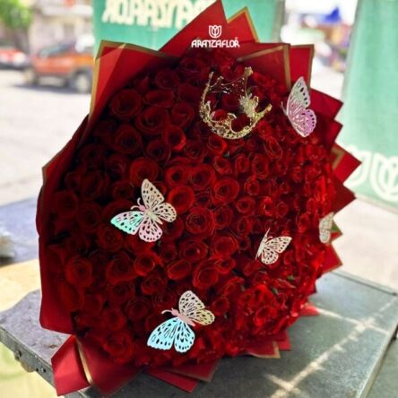 100 ROSAS EN BOUQUET, LAS ROSAS REPRESENTA EL AMOR Y LA CANTIDAD LO GRANDE E INMENSO INCLUYE LAS MARIPOSITAS